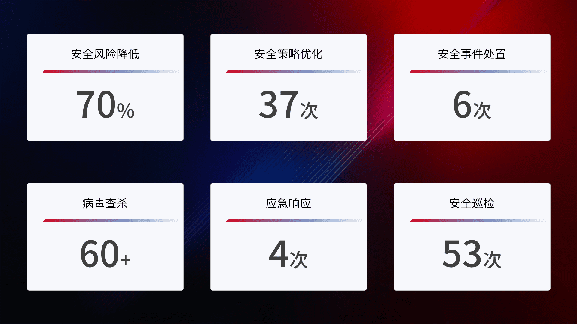 提供全面的安全事件报告体系,,,包括处置报告、、、周报、、季度和年度总结,,结合持续监控,,,帮助客户深入了解网络安全状况。。。